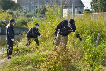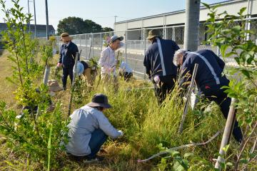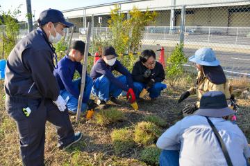 今年で3年目の活動ということもあり、在来種の野草の姿が少しずつ増え始めていましたが、まだまだ外来種のほうが多い状態だったので、前回と同じく草刈りから始めました。協力企業、団体、有志の個人が今回も参加して頂き、のべ40人近くの参加者で外来種を除草したあと、今回は在来種が増えるよう種や苗、芝を植えました。