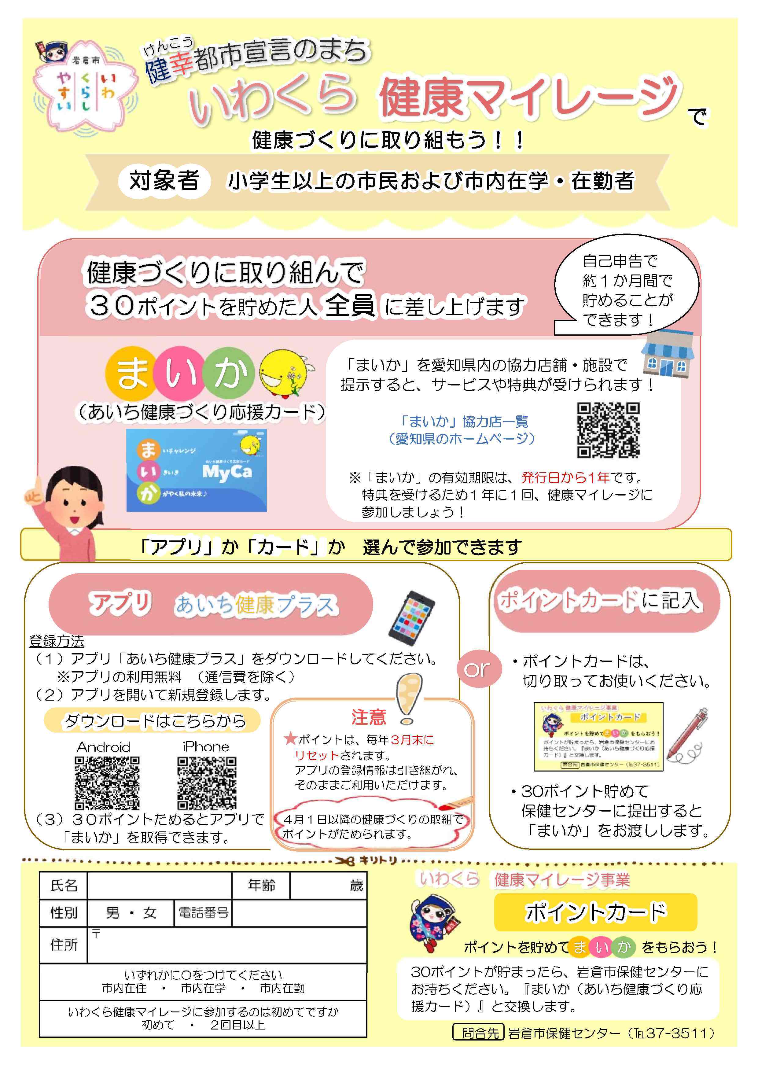 アプリ『あいち健康プラス』を使って、いわくら健康マイレージ事業に参加できます!