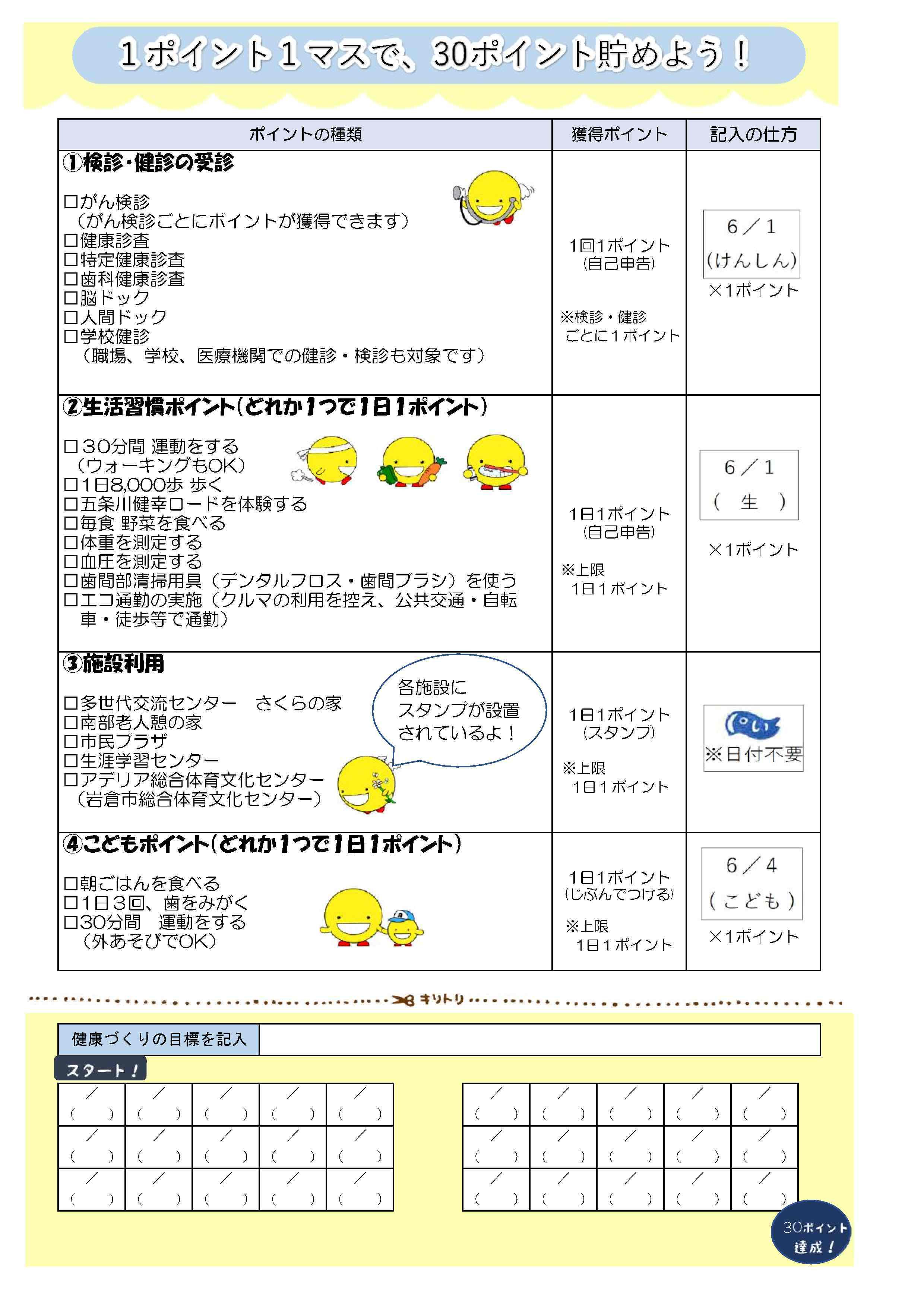 ポイントカード(裏) (PDF形式、478.45KB)裏面に目標と健康づくりに取り組んだ日付をご記入ください。