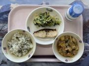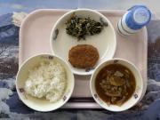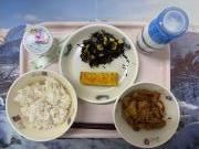 わかめごはん、牛乳、ひらすの塩こうじ焼き、しそひじきのあえもの、高野豆腐のうま煮