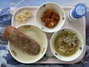 ロールパン(小)、シナモン揚げパン(中)、牛乳、じゃがいものアラビアータ、豚肉と野菜のスープ煮、バナナチップス