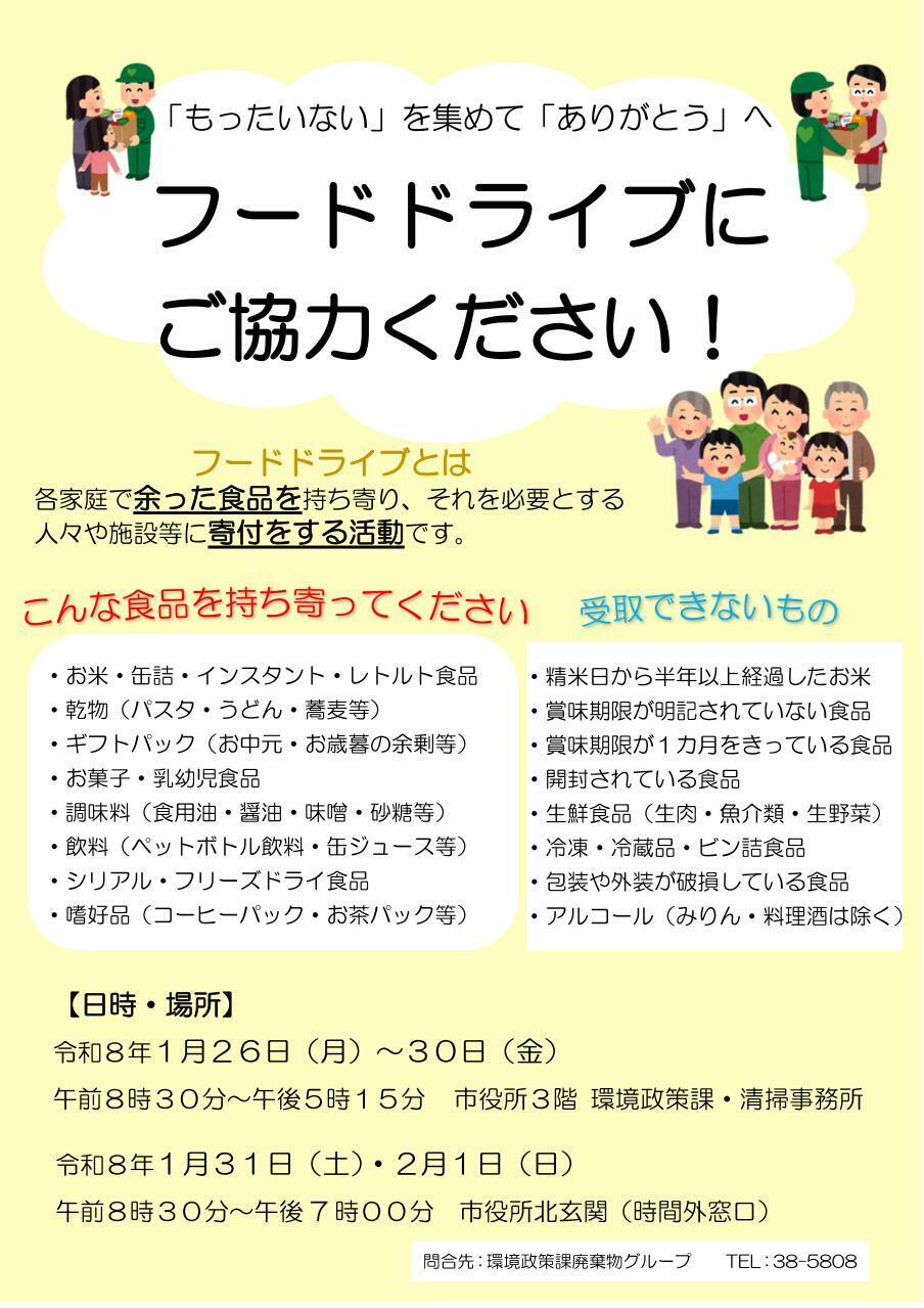 生活困窮者等の支援や食品ロスの削減のため、以下のとおりフードドライブを実施しますので、積極的な食品の提供にご協力をお願いします。