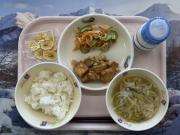 ごはん、牛乳、ぎょうざの甘酢あんかけ、(小2こ、中3こ)、野菜とビーフンの炒め物、チンゲン菜の中華スープ