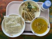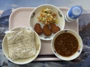 五目きしめん(きしめん)、牛乳、れんこん入りミンチカツ、和風サラダ
