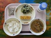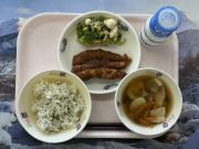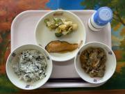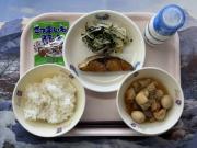 わかめごはん、牛乳、ぶりの生姜だれかけ、根菜の煮物、なめこのみそ汁
