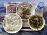 ごはん、牛乳、いわしの蒲焼き、ほうれん草ともやしのあえもの、白みそ汁、節分豆