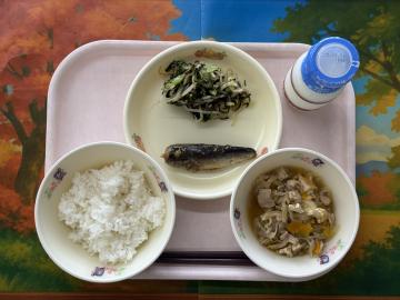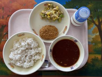 ごはん、牛乳、鰹と大豆のあけぼのあえ、かおりあえ、かきたま汁