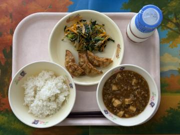 ごはん、牛乳、秋なす入り麻婆豆腐、揚げぎょうざ(小2こ、中3こ)、小松菜のナムル
