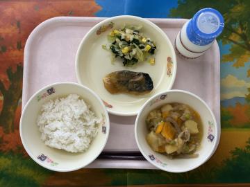 ごはん、牛乳、さばのみそだれかけ、なめたけあえ、肉じゃが