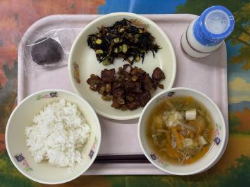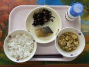 ごはん、牛乳、かつおと大豆の黒糖だれ、ひじきの炒め煮、鶏だんご汁、おはぎ