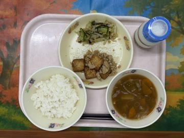 ごはん、牛乳、中華卵焼き、厚揚げの中華みそ炒め、ごまキムチスープ