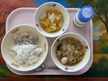 ごはん、牛乳、ぎょうざの甘酢あんかけ(小2こ 中3こ)、野菜とビーフンの炒め物、八宝湯