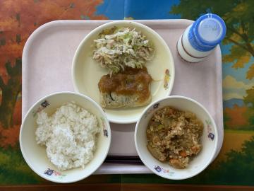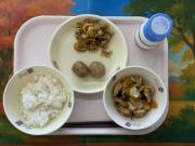 ごはん、牛乳、つくね(小2こ、中2こ)、にんじんのきんぴら、関東煮