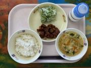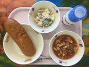 ロールパン(小)、きなこ揚げパン(中)、牛乳、じゃがいものアラビアータ風、豚肉と野菜のスープ煮、ぶどうゼリー