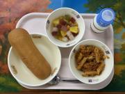 クロスロール、牛乳、メンチカツ、ポトフ、フルーツのゼリーあえ