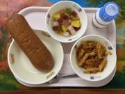 シナモン揚げパン、牛乳、ミートソースのペンネ、フルーツポンチ