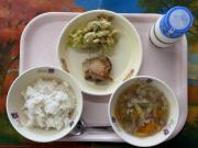 ごはん、牛乳、鶏肉とじゃがいものあけぼのあえ、みんな大すきい~わくんのみどりがおいしい~わ、すいとん汁
