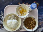 ごはん、牛乳、しゅうまい、(小2こ、中3こ)、麻婆豆腐、フルーツ杏仁
