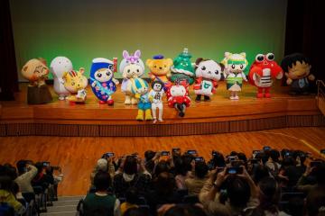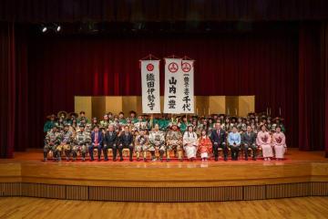 あいにくの雨で一豊行列は中止となりましたが、多目的ホールでの写真撮影には多くの人が集まり、記念撮影を楽しむ姿がみられました。
