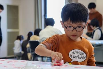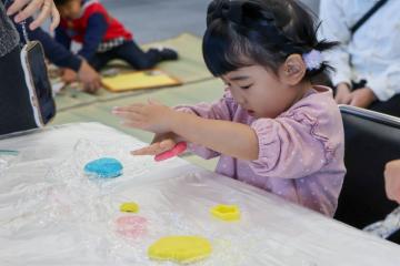 続いてこどもたちは、紙コップを使って絵本に出てくるキャラクターをつくったり、色鮮やかな3色の小麦粉ねんどで自由に色を表現したり、パズルに夢中になったりと、絵本の世界をイメージした遊びや工作を楽しみました。