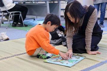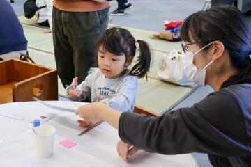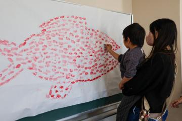 また、「スイミー」をモチーフにしたスタンプ遊びでは、みんなで協力してスタンプを押し、大きな魚の姿が完成すると、こどもたちは笑顔を見せていました。