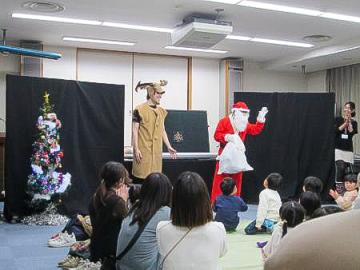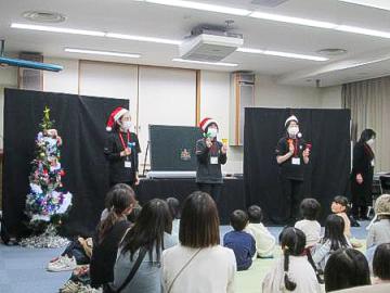 ボランティアおはなし会の皆さんのハンドベル演奏やオカリナに合わせてクリスマスソングを歌ったり、ブラックシアターの上演など、ロマンチックな情景を楽しみました。