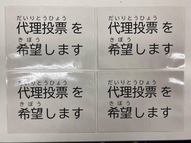 なお、投票所の入口に「代理投票を希望します」と書かれたカードを用意しています。代理投票を希望される方は、そのカードをとって、受付にいる職員に渡してください。