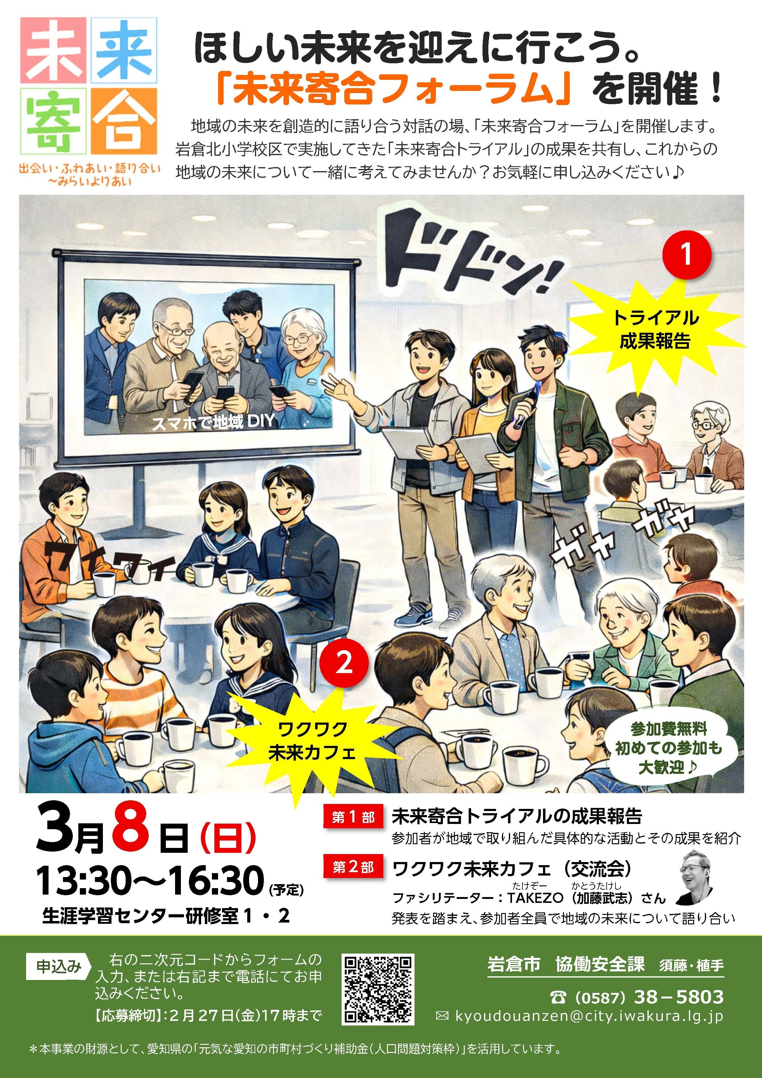 地域の未来を創造的に語り合う対話の場、「未来寄合フォーラム」を開催します。岩倉北小学校区で実施してきた「未来寄合トライアル」の成果を共有し、これからの地域の未来について一緒に考えてみませんか?