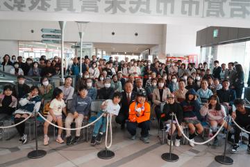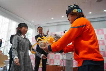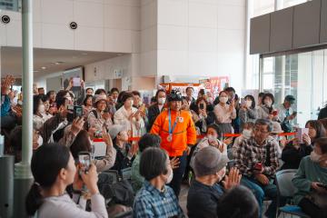 セレモニーには、平日の昼間にも関わらずメダリストを一目見ようと沢山の人がおしかけ、長谷川さんを大きな拍手でお迎えしました。セレモニーでは、こどもたちから花束とお祝いのメッセージが贈られ、長谷川さんの活躍を祝いました。